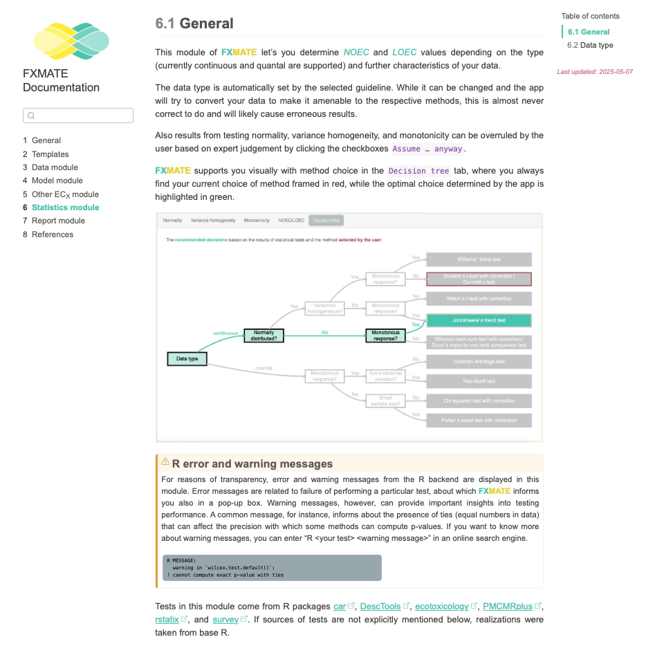 By merging methodological rigor, practical usability, and open science principles, FXMATE aims to enhance the consistency and transparency of ecotoxicity data analysis across academia, industry, and regulatory agencies. In doing so, it contributes to a broader community effort to modernize ecotoxicological statistics and strengthen the scientific foundations of environmental risk assessment.
