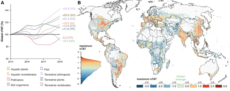 Figure 2: (A) Global trends of the Total Applied Toxicity of pesticides for 8 organism groups. (B) The global distribution of the maximum nTAT. The maximum nTAT is a relative measure that displays the most affected species group and how it is distributed spatially. You can see some global areas, e.g., in Brazil or the US, where certain organism groups are particularly impacted. Credits to AAAS Science. Figure created by Jakob Wolfram (RPTU).
