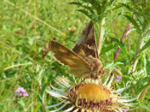 The Silver Y (Autographa gamma) is one of the rarer diurnal moths that can be observed in the agricultural landscape visiting many different flowers (photo by C. Brühl).